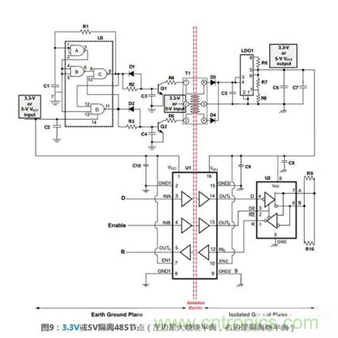 此外,使用低功耗計(jì)數(shù),可以使用小型隔離變壓器。如圖9所示,收發(fā)器使用SN65HVD10,當(dāng)然任何TI公司3.3V或5V RS485收發(fā)器、3.3-V TIA/EIA-644 LVDS或者3.3-V TIA/EIA-899 M-LVDS收發(fā)器都可以使用這個(gè)電路。2.4.2操作原理圖9所示的例子可用于3.3V或5V,電源使用變壓器隔離,數(shù)據(jù)信號(hào)采用數(shù)字隔離器隔離。因?yàn)?85收發(fā)器需要隔離電源,可調(diào)LDO穩(wěn)壓器必須被隔離。