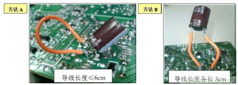 B. 方法(2):在電源板的錫面找出待測電容正負極對應的焊點,焊上兩根導線,然后用電壓探頭夾住引出的導線測試.如下圖: