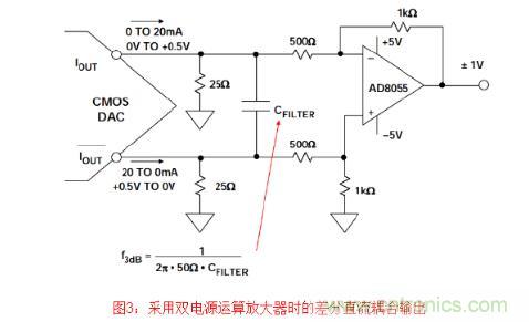 需要低至DC的頻率響應(yīng)時(shí),可以連接運(yùn)算放大器作為差分轉(zhuǎn)單端轉(zhuǎn)換器來(lái)獲取單端輸 出。 在圖3中,運(yùn)算放大器AD8055用于實(shí)現(xiàn)高帶寬和低失真。電流輸出DAC驅(qū)動(dòng)平衡的 25 Ω阻性負(fù)載,從而在各輸出端產(chǎn)生0至+0.5 V的錯(cuò)相電壓。這項(xiàng)技術(shù)用于代替直接I/V轉(zhuǎn) 換,從而防止高壓擺率DAC電流導(dǎo)致放大器過(guò)載和引入失真。必須小心地處理使DAC輸 出電壓位于其順從電壓額定值范圍之內(nèi)。