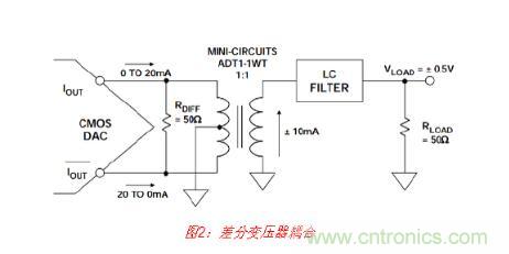 變壓器不僅用于將差分輸出轉(zhuǎn)換成單端信號(hào),而且還將DAC的輸出與LC濾波器的抗性負(fù) 載隔離開(kāi)來(lái),因而可以改善整體失真性能。