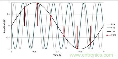 為了準確地測量輸入正弦波,采樣率必須滿足那奎斯特采樣標準。在上面的示例中,你需要將采樣率至少增加到12SPS。恰恰在12SPS時,6Hz輸入將仍然折返至DC,并且會在測量值中增加一個偏移,所以,采樣只快了一點點,確保你所需要的信號根本就不會發(fā)生混疊。