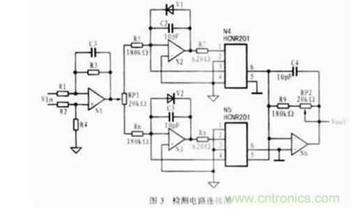 在實(shí)際檢測電路的某一采集信道中,如需對一組差動(dòng)輸入信號進(jìn)行檢測,可將電路接成如圖3所示的連接方式。圖中,通過放大器N1可將輸入的差動(dòng)信號變?yōu)閱芜呅盘柡筝敵?。由于二極管V1和V2的作用,當(dāng)輸入信號為正時(shí),V2導(dǎo)通,V1截止,放大器N2呈開環(huán)狀態(tài),光耦N5工作,N4關(guān)斷;而當(dāng)輸入信號為負(fù)時(shí),則正好相反。當(dāng)HCNR201的第3、4端的光敏二極管受光后,其輸出信號將反饋到放大器的輸入端,以提高光耦的線性并減少溫漂。第5、6端輸出的信號經(jīng)運(yùn)放放大后輸出。電位器RP1的作用是調(diào)節(jié)運(yùn)放輸入偏置電流的大小。電容C2、C3為反饋電容,可用于提高電路的穩(wěn)定性,消除自激振蕩,濾除電路中的毛刺信號,降低電路的輸出噪聲,其容值可根據(jù)電路的頻率特性來選取。放大器N6的作用是把光耦輸出的電流信號轉(zhuǎn)變?yōu)殡妷盒盘栆怨┖蠹夒娐肥褂?,并增?qiáng)負(fù)載驅(qū)動(dòng)能力,降低輸出阻抗。調(diào)整電阻RP2的值可以調(diào)整信道的增益。