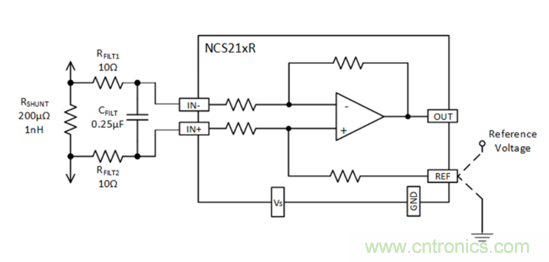 在瞬態(tài)共模電壓大于30伏特(V)的應用中,需要瞬態(tài)抑制電路。有關(guān)如何設(shè)計瞬態(tài)抑制電路的詳細信息,請參閱NCS21xR數(shù)據(jù)表中的基本連接應用注釋。