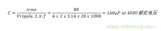 如果僅需要電容器來控制電動(dòng)汽車動(dòng)力系統(tǒng)等直流線路上的紋波電壓,則在選擇電容器時(shí)將會(huì)呈現(xiàn)顯著不同。 總線電壓可能與以前一樣為400V,但由采用電池供電,因此不存在穿越需求。在下游轉(zhuǎn)換器以20kHz的開關(guān)頻率提取80Arms脈沖電流時(shí),將紋波限制在4Vrms以內(nèi)是非?,F(xiàn)實(shí)的, 所需的電容是: