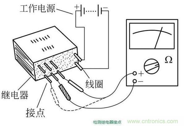 給繼電器線圈接上規(guī)定的工作電壓,用萬用表“Rx1K”檔,檢測(cè)節(jié)點(diǎn)的通斷情況。