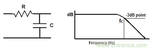 在該公式中,fc是濾波器的截止頻率,如圖2中的性能與頻率曲線圖以及如圖3等效電路的R(電阻)和C(電容)所示。
