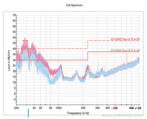 然后,使用22000pF芯片電容濾波器插件進行測試,試圖將最大濾波器性能調(diào)整到噪聲持續(xù)的較低頻率區(qū)域。如圖9所示,性能得到改善,在較低頻率的噪聲極限處或附近只有很小的尖峰。但是這個濾波器導(dǎo)致能量“膨脹”到105MHz附近的更高頻率,超過了允許的極限。