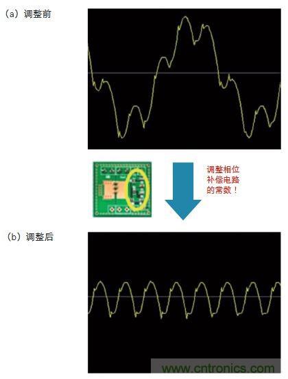 詳情請參見圖2。圖2(a)是單純把構成DC-DC轉換器輸出平滑電路的電容器由鉭電解電容器更換成片狀多層陶瓷電容器后的輸出電壓波形。波形出現(xiàn)了異常振蕩,DC-DC轉換器的輸出電壓也隨之大幅變化。圖2(b)是對反饋環(huán)路相位補償電路的常數(shù)進行調整后的波形。波形的異常振蕩得到了抑制,輸出電壓降到了不會產生負面影響的水平。實際使用中如果達到了這種輸出電壓波形,就可放心使用。