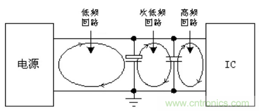 電路板入口處的電源去耦:大多數(shù)電路板的電源入口處去耦包括一個大的去耦電解電容并一到兩個小的高頻去耦電容,主要作用是為數(shù)字電路提供再充電,同時減少高頻噪聲。