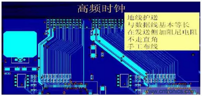 10、高頻信號線要遠離時鐘或晶振走線,如時鐘線和高速信號線盡量不要平行走線,確因?qū)嶋H情況需平行走線,應用地線隔開。