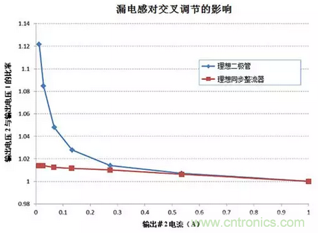圖5:該圖顯示了兩個(gè)輸出之間的交叉調(diào)節(jié),其中1號(hào)輸出上的1-A負(fù)載保持穩(wěn)定,而2號(hào)輸出上的負(fù)載不斷變化,從而凸顯了同步整流器如何減輕漏電感的影響。