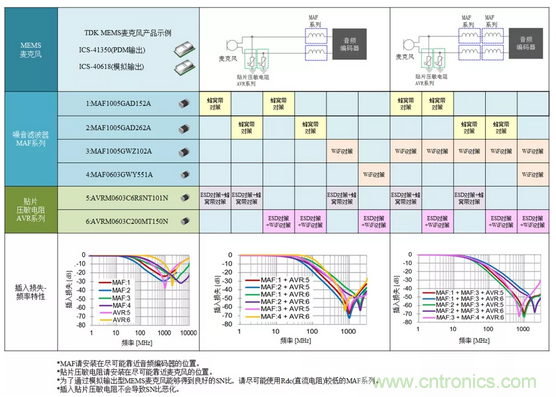 TDK推薦用于抑制麥克風線蜂窩網(wǎng)絡(luò)頻帶(700MHz~1GHz、 1.5GHz~2.8GHz)以及WiFi (2.4GHz、3~5GHz) 的TDMA噪音、改善接收靈敏度、抑制ESD的MAF系列與貼片壓敏電阻AVR系列的產(chǎn)品組合示例如下所示(圖9)。