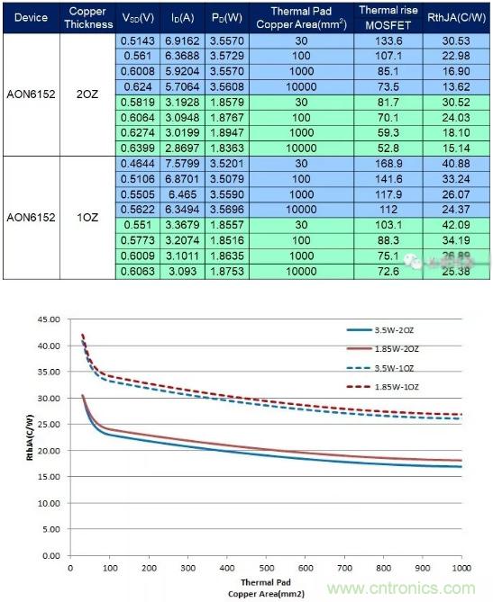 下面分別以一塊10cmX10cm、2OZ覆銅的二層PCB板來(lái)做試驗(yàn),板厚1.5mm,PCB底層覆銅沒(méi)有通過(guò)過(guò)孔連接到頂層,將封裝為DFN5*6器件AON6152焊接在PCB板,同時(shí)AON6152的D極下面分別鋪設(shè)四種不同尺寸的銅皮:30mm2、100mm2、1000mm2、10000mm2。然后給四塊板的AON6152灌入相同的功率,測(cè)量AON6152的溫升,計(jì)算相應(yīng)的熱阻RJA。將AON6152灌入功率減小一半,重復(fù)上面的實(shí)驗(yàn),測(cè)量其溫升,再次計(jì)算相應(yīng)的熱阻RJA。