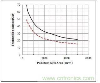 SO8封裝的標(biāo)準(zhǔn)熱阻為:RJA=90C/W,RJC=12C/W;Ultra SO8封裝的標(biāo)準(zhǔn)熱阻為:RJA=50C/W,RJC=2.5C/W。這二種封裝PCB銅皮尺寸和對(duì)應(yīng)熱阻關(guān)系如圖11所示。