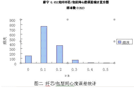對于原材料之一的緊套光纜及光纖,成都康寧光纜全部采用美國康寧產(chǎn)光纖,依托康寧公司全球領(lǐng)先的光纜制造技術(shù),制造出國內(nèi)領(lǐng)先水平的緊套光纜,并用之于本公司的連接器跳線的生產(chǎn),確保光纖光纜原材料的品質(zhì)。圖二和圖三即是本公司采用的康寧公司G652光纖的主要特性參數(shù),其纖芯/包層同心度誤差和衰減系數(shù)統(tǒng)計(jì)值均遠(yuǎn)好于國內(nèi)相關(guān)行業(yè)標(biāo)準(zhǔn)的要求(行業(yè)標(biāo)準(zhǔn)的要求分別為≤0.5μm和≤0.5dB/km):