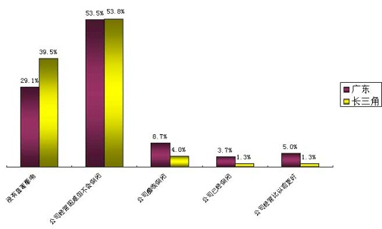 此項(xiàng)調(diào)查結(jié)果出乎我們的意料,選擇裁員的企業(yè)已經(jīng)占到了20.8%,但是多數(shù)企業(yè)還是選擇了調(diào)整經(jīng)營(yíng)策略。我們特別希望有遠(yuǎn)見的企業(yè)不要把裁員作為應(yīng)對(duì)危機(jī)的主要措施,這也不符合我們“和諧社會(huì)”的主旋律。只要能正確的面對(duì),認(rèn)真分析企業(yè)的優(yōu)勢(shì),研究市場(chǎng)的動(dòng)向,合理配置企業(yè)資源,充分發(fā)揮員工的潛力,調(diào)動(dòng)員工的積極性,企業(yè)一定會(huì)有新的轉(zhuǎn)機(jī)。企業(yè)如能和員工共克時(shí)艱,就會(huì)加深員工對(duì)企業(yè)的感情,這種情感會(huì)轉(zhuǎn)化為企業(yè)的一種優(yōu)勢(shì)資源。(見圖表四)