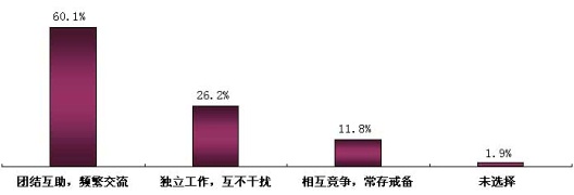 為了更深入了解電子工程師的生存環(huán)境,我們特意設(shè)置了這個(gè)問(wèn)題。對(duì)每一位工程師來(lái)說(shuō),同事關(guān)系處理的如何,直接影響著他們的工作質(zhì)量和生活質(zhì)量,良好的同事關(guān)系,利人利己,利公利私。特別讓我們欣慰的是,60.1%的電子工程師和同事處于團(tuán)結(jié)互助,頻繁交流的工作狀態(tài),在目前經(jīng)濟(jì)危機(jī)的陰霾籠罩下,這樣同事關(guān)系顯的尤為重要。(見圖表七)