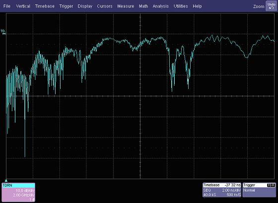 回波損耗或S11 是頻域的測(cè)量和反射系數(shù)有關(guān)。歸一化(通過(guò)反射平面校準(zhǔn) 基線校正)反射系數(shù)的傅里葉變換給出了回波損耗是頻率的函數(shù)。圖2給出了USB 3.0線纜和連接器測(cè)量的結(jié)果。圖中的橫軸表示2GHz/div,范圍是0~20GHz,縱軸表示10dB/div?;夭〒p耗在2GHz大約是15dB,但隨著頻率的增加開始變得越來(lái)越小。精細(xì)的空值間隔是由線纜末端的連接器引起的,較大的空值間隔是由于連接器內(nèi)部的阻抗結(jié)構(gòu)決定的。