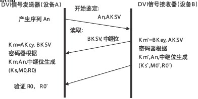 HDCP具體工作過程:首先由主機發(fā)送密鑰選擇導引序列(AKSV)和64bit偽隨機序列(An)到接收方,接收方回傳密鑰選擇導引序列(BKSV)和轉發(fā)器位(REPEAT-bit)(如是轉發(fā)器用以表示身份),發(fā)送方確認BKSV是否已被廢除和是否包含20個1和20個0;如果雙方的設備密鑰和KSV有效,則計算產生一個56bit的公共密鑰Km和Km`,然后可產生KS、KS`(傳輸密鑰)、M0、MO`(64bit后續(xù)驗證用追加初始序列)、RO、R0`(16bit指示驗證成功,它必須在AKSV發(fā)送后100ms內傳回發(fā)送方;驗證成功后R01和R0相等;每128幀修正一次,每2s回傳一次)。因此當DVI接口中斷傳輸2s以上,或是非授權設備接收時,主機將停止傳輸內容,以達到保護傳輸內容的目的。HDCP鑒定處理過程如圖6所示。