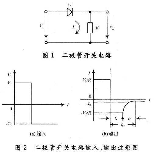 [page]如圖1所示,輸入端施加一脈沖信號Vi,其幅值為+V1和-V2。當加在二極管兩端的電壓為+V1,二極管導(dǎo)通;當加在二極管兩端的電壓為-V2,二極管截止,輸入、輸出波形如圖2所示。二極管兩端的電壓由正向偏置+V1變?yōu)榉聪蚱?V2時,二極管并不瞬時截止,而是維持一段時間ts后,電流才開始減小,再經(jīng)tf后,反向電流才等于靜態(tài)特性上的反向漂移電流I0,其值很小。ts稱為存貯時間,tf稱為下降時間,ts+tf=trr稱為關(guān)斷時間。二極管兩端的電壓由反向偏置-V2變?yōu)檎蚱?V1時,二極管也不是瞬時導(dǎo)通,而是經(jīng)過導(dǎo)通延遲時間和上升時間后才穩(wěn)定導(dǎo)通,這段時間稱為開通時間。顯然二極管的導(dǎo)通和截止時刻總是滯后加于其兩端高、低電平的時刻。二極管從截止轉(zhuǎn)為正向?qū)ǖ拈_通時間,與從導(dǎo)通轉(zhuǎn)向截止時的關(guān)斷時間相比很小,其對開關(guān)速度的影響很小,在分析討論中主要考慮關(guān)斷時間的影響。
