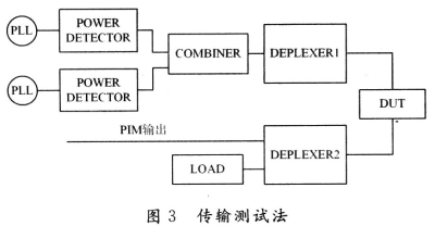 該系統(tǒng)中兩個大功率載頻f1和f2通過雙工濾波器發(fā)射到DUT,終端接50 Ω負(fù)載。PIM產(chǎn)生的雜散信號在DUT中產(chǎn)生,并在兩個方向傳播——“前向”到匹配負(fù)載,“反向”到雙工濾波器。發(fā)射激勵信號的頻率和被測的IM產(chǎn)物的頻率由雙工濾波器的TX和RX通道決定。接收機(jī)測量反向傳播的IM波功率。