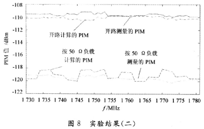 由以上的分析可知,這種計算方法計算出來的PIM值和真實(shí)的PIM值十分接近,并且隨頻率的變化趨勢一致。同時可以看出,在開路的時候所測量的 PIM明顯要比接負(fù)載的時候所測量的PIM要大,增大的PIM值是因?yàn)槠ヅ洳缓盟斐?,?dāng)然,相同的負(fù)載狀況在不同的頻率下呈現(xiàn)的匹配狀態(tài)是不一樣的。