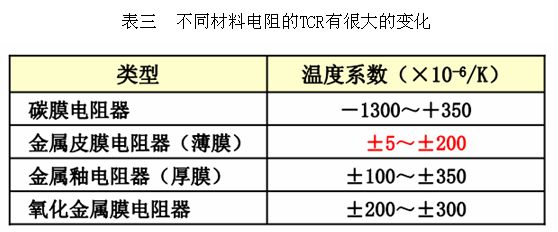 目前TCR小的電阻器只有薄膜電阻,一般情況下,碳膜與陶瓷電阻器TCR為負(fù),對(duì)于低TCR設(shè)計(jì),首選推薦10ppm。不同材料電阻的TCR有很大的變化,大致范圍可以從下表看出: