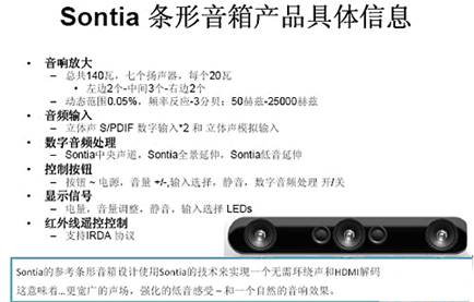 Sontia的業(yè)務(wù)模型比較有特點,也采用授權(quán)模式,主要模式是Sontia授權(quán)其3-聲道條形音箱參考設(shè)計,Sontia為OEM提供了一個可以直接生產(chǎn)的完整套裝,或者采用預付版權(quán)費以及與銷售量有關(guān)的版權(quán)費模式,Sontia未來的產(chǎn)品走向?qū)⑾蚋叨藯l形音箱參考設(shè)計、便攜式多媒體播放器的底座(iPod)以及Sontia的數(shù)字音頻處理技術(shù)直接嵌入到電視里中的軟件解決方案發(fā)展。