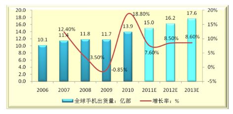 - 預(yù)計(jì)2010-2013年全球手機(jī)出貨量將保持7%以上的增速