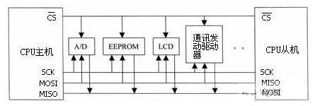 SPI(serial peripheral interface,串行外圍設(shè)備接口)總線技術(shù)是Motorola公司推出的一種同步串行接口。它用于CPU與各種外圍器件進行全雙工、同步串行通訊。它只需四條線就可以完成MCU與各種外圍器件的通訊,這四條線是:串行時鐘線(CSK)、主機輸入/從機輸出數(shù)據(jù)線(MISO)、主機輸出/從機輸入數(shù)據(jù)線(MOSI)、低電平有效從機選擇線CS。當(dāng)SPI工作時,在移位寄存器中的數(shù)據(jù)逐位從輸出引腳(MOSI)輸出(高位在前),同時從輸入引腳(MISO)接收的數(shù)據(jù)逐位移到移位寄存器(高位在前)。發(fā)送一個字節(jié)后,從另一個外圍器件接收的字節(jié)數(shù)據(jù)進入移位寄存器中。即完成一個字節(jié)數(shù)據(jù)傳輸?shù)膶嵸|(zhì)是兩個器件寄存器內(nèi)容的交換。主SPI的時鐘信號(SCK)使傳輸同步。其典型系統(tǒng)框圖如下圖所示。
