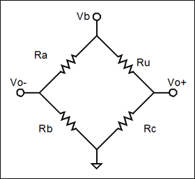 圖9是一個(gè)由同一電壓源供電的兩個(gè)分壓器組成的惠斯通電橋。習(xí)慣將電橋畫成菱形,因?yàn)檫@種形狀強(qiáng)調(diào)了同一電壓源為每個(gè)分壓器供電的重要性。電橋的輸出(Vo)是兩個(gè)分壓器輸出電壓之差(公式15)。當(dāng)Vo為零時(shí),稱電橋達(dá)到平衡。在這種條件下,因?yàn)閂e與一個(gè)為零項(xiàng)相乘,所以激勵(lì)電壓(Ve)的精確值并不重要。公式16可計(jì)算出平衡電橋中未知電阻(Ru)的阻值。在實(shí)際應(yīng)用中,通常使Ra = Rb,這樣公式16可簡(jiǎn)化為Ru = Rc。