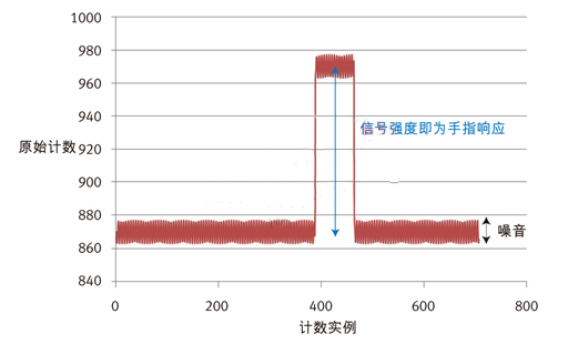 圖5:原始傳感器數(shù)據(jù)由手指響應(yīng)和噪音構(gòu)成。手指響應(yīng),也稱為信號(hào)強(qiáng)度,是當(dāng)手指放在傳感器上時(shí)通過感應(yīng)系統(tǒng)可以看到的原始計(jì)數(shù)的差別