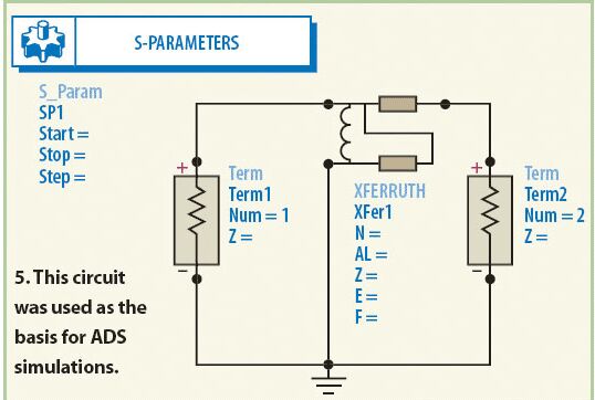 MathWorks的MATLAB數(shù)學(xué)分析軟件曾被用來(lái)分析這種變壓器器件模型的響應(yīng)。分析中,把單獨(dú)的低頻(公式1)響應(yīng)和高頻(公式5)響應(yīng)的插損響應(yīng)結(jié)合在了一起。將所需的目標(biāo)值代入MATLAB公式,可獲得寬帶變壓器的最終響應(yīng)。為了執(zhí)行MATLAB模型數(shù)值響應(yīng)的電氣仿真,使用了ADS建模軟件。該軟件有一個(gè)很有用的內(nèi)部源模型,稱(chēng)為XFERRUTH,其變量參數(shù)包括匝數(shù)(N)、電感因子(AL)、傳輸線(xiàn)特性阻抗(Z)、傳輸線(xiàn)電氣長(zhǎng)度(E),以及計(jì)算傳輸線(xiàn)長(zhǎng)度所需要的參考頻率(F)。