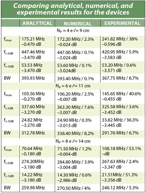 構(gòu)建的第一個(gè)器件線(xiàn)圈匝數(shù)為4,因此傳輸線(xiàn)長(zhǎng)度為9cm。圖8、9和10分別顯示了分析、數(shù)值和實(shí)驗(yàn)三種情況下的頻率插損行為。表中總結(jié)了主要的參數(shù)值,包括最大幅值、-3dB頻率(fmax、fi-3dB和fs-3dB)、適當(dāng)?shù)膸挘˙W),以及相比模型值頻率偏差百分比下的各種插損結(jié)果。通過(guò)分析、數(shù)值和實(shí)驗(yàn)方法獲得的結(jié)果間的偏差非常小,信號(hào)頻率最大時(shí)例外。這都是由于測(cè)量設(shè)置中噪聲和其它寄生效應(yīng)造成的測(cè)試系統(tǒng)的局限性。在幅度基本穩(wěn)定的測(cè)試頻帶上,信號(hào)電平的變化是幾乎察覺(jué)不到的,也許這就是最大信號(hào)幅度頻率的報(bào)告中出現(xiàn)偏差的原因。