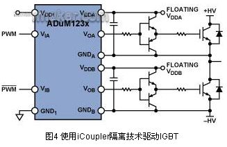 ADI公司的隔離門(mén)級(jí)驅(qū)動(dòng)器系列產(chǎn)品采用iCoupler技術(shù),其中雙通道 ADuM1233(圖3)提供了輸出通道和輸入通道之間的隔離以及兩個(gè)輸出通道之間的隔離,適用于IGBT控制通道的隔離。
