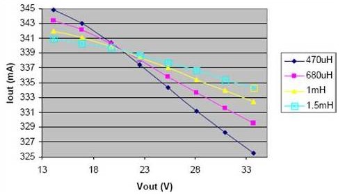 上圖是不同電感值下的頻率響應。下圖說明了電感減小時,在輸入電壓的變化范圍內,負載電流的變化明顯增大。