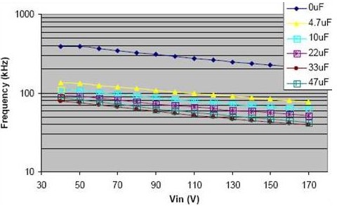 輸出可同時使用輸出電容以達到目標頻率和電流的精確控制。電容能在整個輸入電壓范圍內減小頻率,一個小的 4.7μF 的電容就能顯著減小頻率。電流的調整也能因為電容值的增加而得到改善。從下面圖片可以很容易看到,圖上存在一個拐點,再增加電容值,對操作頻率和輸出電流的調整影響不大。