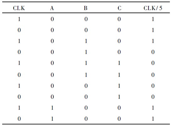 采用基于D 觸發(fā)器結(jié)構(gòu)的五分頻器邏輯框圖如圖1所示。圖1 由3 個D 觸發(fā)器和少量邏輯門構(gòu)成, 采用了同步工作模式, 其原理是由吞脈沖計數(shù)原理產(chǎn)生2 個占空比不同的五分頻信號A 和B, 然后對時鐘信號CLK, A 和B 進(jìn)行邏輯運算得到占空比為50% 的五分頻信號CLK/ 5, 其計數(shù)過程如表1 所示, 從表1 的計數(shù)過程可知, 分頻后的時鐘CLK/ 5 的周期是輸入時鐘CLK 的5 倍, 由此實現(xiàn)了五分頻并且其占空比為50% .