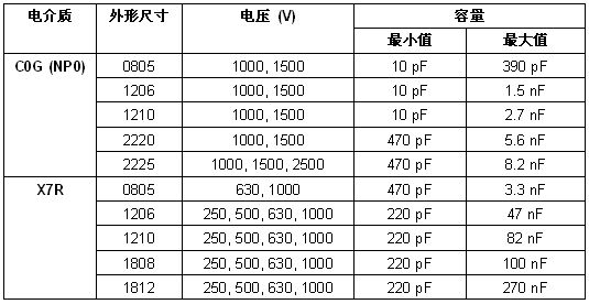 0805外形尺寸的VJ HVArc Guard---X7R MLCC的最低容值提高到470pF。而1206、1210、1808和1812尺寸的最低容值提高到220pF。若需要更低的容值,可采用最低容量為10pF的C0G產(chǎn)品,替代0805、1206和1210外形尺寸1000V X7R的器件。
