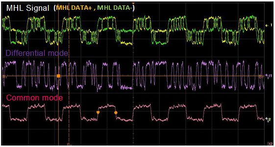 接下來,MHL信號波形的測量結(jié)果如圖3所示。圖3中顯示的是MHL信號的差模成分和共模成分。從圖3我們可以清晰地看到MHL信號中不僅存在差模成分 (差分波形) ,還存在著共模成分。