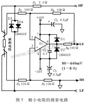 對于極小阻值范圍的電阻測量可以采用圖7所示電路完成,它可以測量10~ 80mΩ的電阻。通過差分運算放大電路,把被測電阻產(chǎn)生的微弱電壓信號放大100倍,因此實際電阻值是測量值要除以100。圖中運放UI采用低噪聲、高速、精密運放,如OP-37EJ,AD645或MAX400。和高電位施加線(HF)串聯(lián)的電阻R1是用來匹配電流施加模塊的最佳輸出負載,R2到R5采用高精度高穩(wěn)定性的電阻來保證差放電路增益的穩(wěn)定,這決定了測量的精度和重復性。為了保證精度,對運放的電源電壓要求很高,電路的安裝位置要盡可能靠近被測電阻,所有探頭要盡可能短,C2,C3要盡可能靠近運放。
