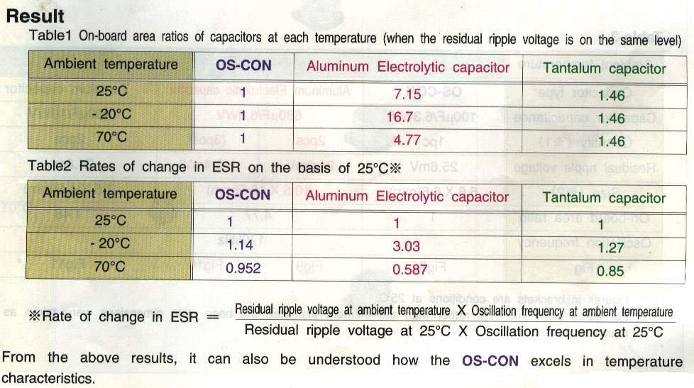 而上圖的表格則表明了,在L/C部分使用不同種類電容的情況下,這個(gè)電路中漣波電壓的表現(xiàn)情況??梢钥闯?,具有LOW ESR性能的鋁固體聚合物導(dǎo)體電容(左邊),其消除漣波電壓的性能最強(qiáng),鉭二氧化錳電容(右邊)性能次之,鋁電解液電容(中間)表現(xiàn)最差。同時(shí)最后的數(shù)值還將受溫度影響,這點(diǎn)我們還將在后面詳細(xì)說明。