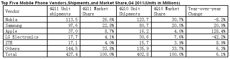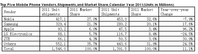 2011 年第四季度,全球共賣出4.274 億部手機.同比去年( 4.028 億部)上升6.1 % ,這一漲勢高于IDC此前預(yù)測的4.4 % 漲幅,但低于2011 年第三季度9.3%的增幅。其中功能機的市場份額比預(yù)期的衰減速度更快,市場增幅為兩年來最低。