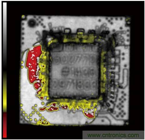 圖2. 過(guò)度加熱引起PBGA器件的基板和塑封材料之間分層(通過(guò)掃描聲學(xué)顯微鏡觀測(cè))