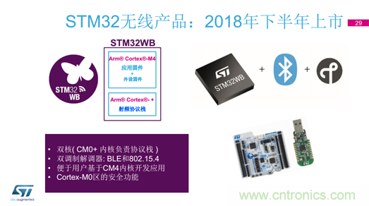 為應(yīng)對日益復(fù)雜的物聯(lián)網(wǎng)協(xié)議及行業(yè)標準,STM32WB應(yīng)運而生。作為STM32系列最重要的無線產(chǎn)品之一,STM32WB的“W”代表無線,“B”代表藍牙。它融合了STM32的生態(tài)系統(tǒng)和架構(gòu),以及開放射頻,擁有2個CPU、2個調(diào)制解調(diào)器和射頻收發(fā)器,能夠覆蓋更多的應(yīng)用領(lǐng)域,特別是無線應(yīng)用。STM32WB的雙核(CM0+ 內(nèi)核負責協(xié)議棧)保留了Arm® Cortex®-M4部分,其復(fù)制了L4系列的架構(gòu),這意味著用過L4產(chǎn)品的開發(fā)商可以輕松使用STM32WB產(chǎn)品。而且STM32WB的部分產(chǎn)品樣片已經(jīng)在今年2月份面世,預(yù)計到年底就能實現(xiàn)大規(guī)模上市。