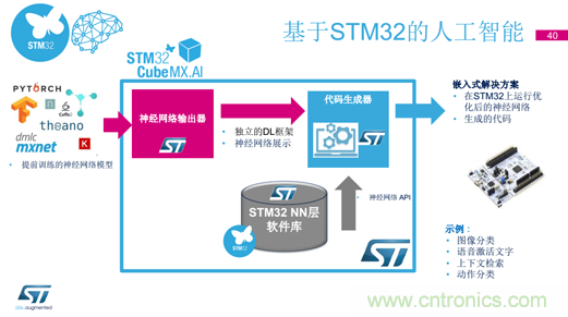 “順應(yīng)嵌入式行業(yè)潮流,ST將會在STM32新產(chǎn)品中嘗試融合RTOS和Linux兩大系統(tǒng)。同時,在數(shù)據(jù)安全方面,ST支持TrustZone的全新系列產(chǎn)品也即將上市,通過采用STM32架構(gòu)和Arm® Cortex-M33® 內(nèi)核實現(xiàn)了更高的安全性。而且ST還開發(fā)出STM32物聯(lián)網(wǎng)安全工具箱,能夠在STM32上實現(xiàn)可擴展的嵌入式安全功能;以及通過認證的STM32軟件開發(fā)工具——符合IOS智能家居標準的Apple Homekit BLE,這套工具將于2018年中期率先支持STM32L476 (512 kB+閃存)和 STM32F413平臺,之后支持STM32WB系列。”Daniel Colonna強調(diào),“ST還將致力于為廣大工程師帶來更簡單的AI開發(fā)工具,允許在STM32上運行優(yōu)化后的神經(jīng)網(wǎng)絡(luò)生成的代碼,加速開發(fā)圖像分類、語音激活文字等應(yīng)用。”