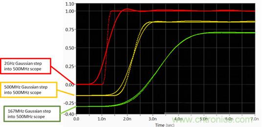圖2:500MHz帶寬示波器對(duì)于不同階躍響應(yīng)的曲線