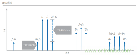 在許多器件的線性工作區(qū)域中,一階音和三階失真產(chǎn)物的比率常常很高。然而,隨著基音輸入功率的增加,三階失真產(chǎn)物也隨之增加。實(shí)際上,基音的功率每增加1 dB,互調(diào)失真產(chǎn)物會(huì)增加3 dB。