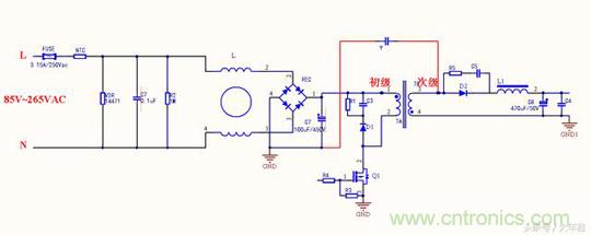 初級地我們也經(jīng)常成為“熱地”,次級地經(jīng)常被稱為“冷地”,Y電容跨接在變壓器初級地與次級地之間這是最為常見的連接方式,而且一般都是成雙成對出現(xiàn),因為腳距太短,不能做到完全隔離。開關(guān)電源當中,開關(guān)管的不斷導通與閉合會產(chǎn)生噪聲,如下圖的Q1,主要表現(xiàn)在瞬間電壓尖峰脈沖信號,信號噪聲流向變壓器的初級線圈,而線圈相當于一個電感,此時會產(chǎn)生反向較高的電動勢,同時產(chǎn)生的高次諧波耦合到變壓器初級,造成噪聲騷 擾。初級地和次級地之間加一個 Y 電容,可以在變壓器的次級地與大地間建立一個泄放通道,開關(guān)噪聲的高次諧波通 過這個通道泄放到大地,從而避免通過供電線路輻射出去,降低開關(guān)電源的輻射騷擾。
