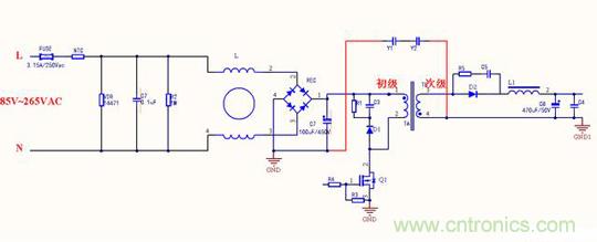 變壓器的每個線圈繞組之間有寄生電容存在,在工作時過程當中形成電壓,成為噪聲源頭,在初始高壓與次級地之間跨接Y電容,能濾除初級和次級耦合產(chǎn)生的共模干擾,這與第一種差不多,只是在EMI測試時候結(jié)果會有所不同。